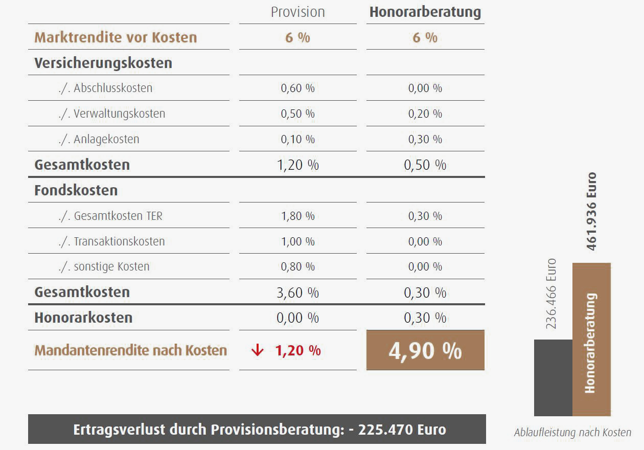 Derart teure Produkte sind am Markt leider keine Seltenheit. Im Vergleich zu einer Honorarberatung verlieren Sie durch die vermeintlich kostenfreie Beratung des Vermittlers 225.470 Euro durch hohe Produktkosten und gefährden so Ihre Altersvorsorge.